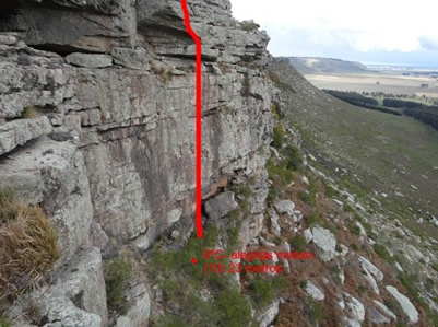 Contando también con un acceso por rappel . se encuentra marcado con unos postes pintados con pintura naranja fluor, para llegar si venimos por el borde de la sierra debemos pasar el acceso al sector del rapel del NIDO, encontaremos enseguida un bosque , un primer palo pitado de naranja que nos marca la bajada al la via TODOS LAS VIERON , parado sobre este poste en dirección oeste se puede ver el poste que marca el rappel al sector . tiene un largo de 25 metros y termina aéreo .